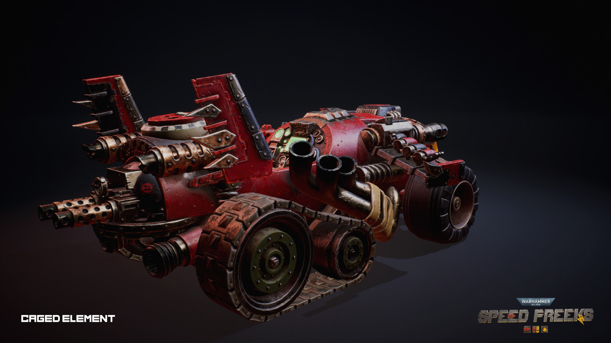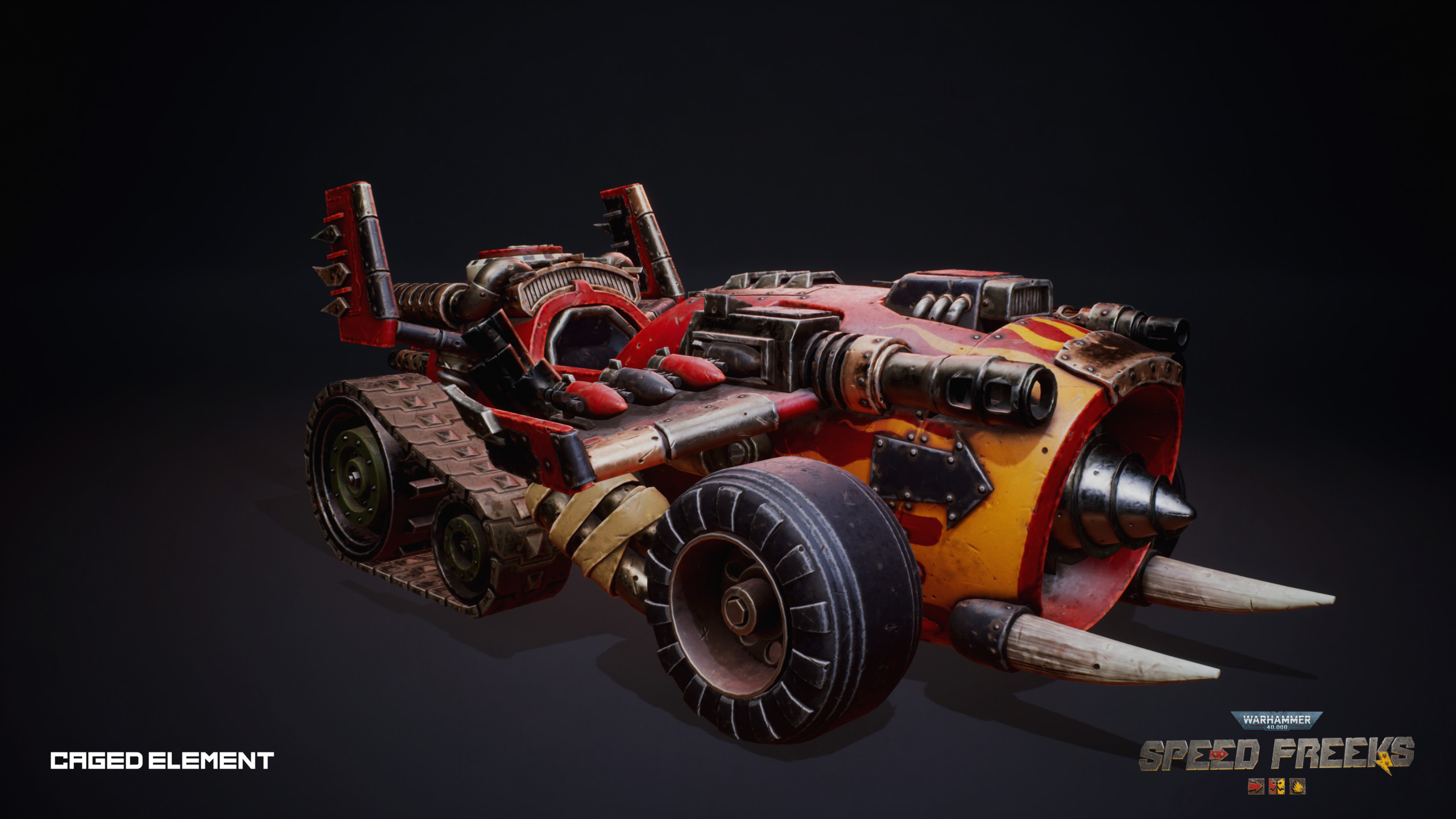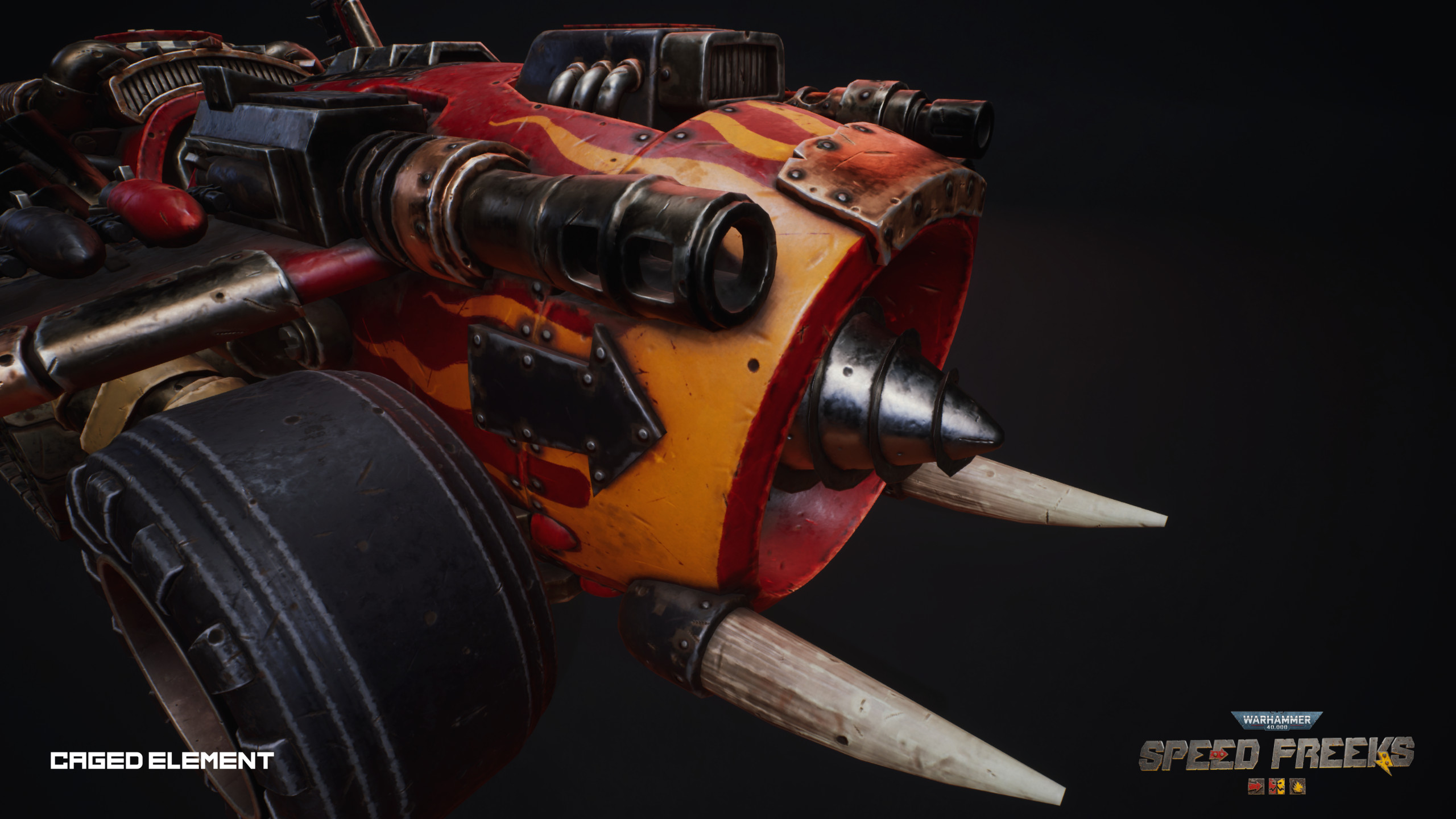 During the development of Warhammer 40K Speed Freeks I was responsible to make a Megatrakk Scrapjet variant that's themed in a Evil Sunz clan aesthetic while maintaining the iconic silhouette of the Scrapjet.